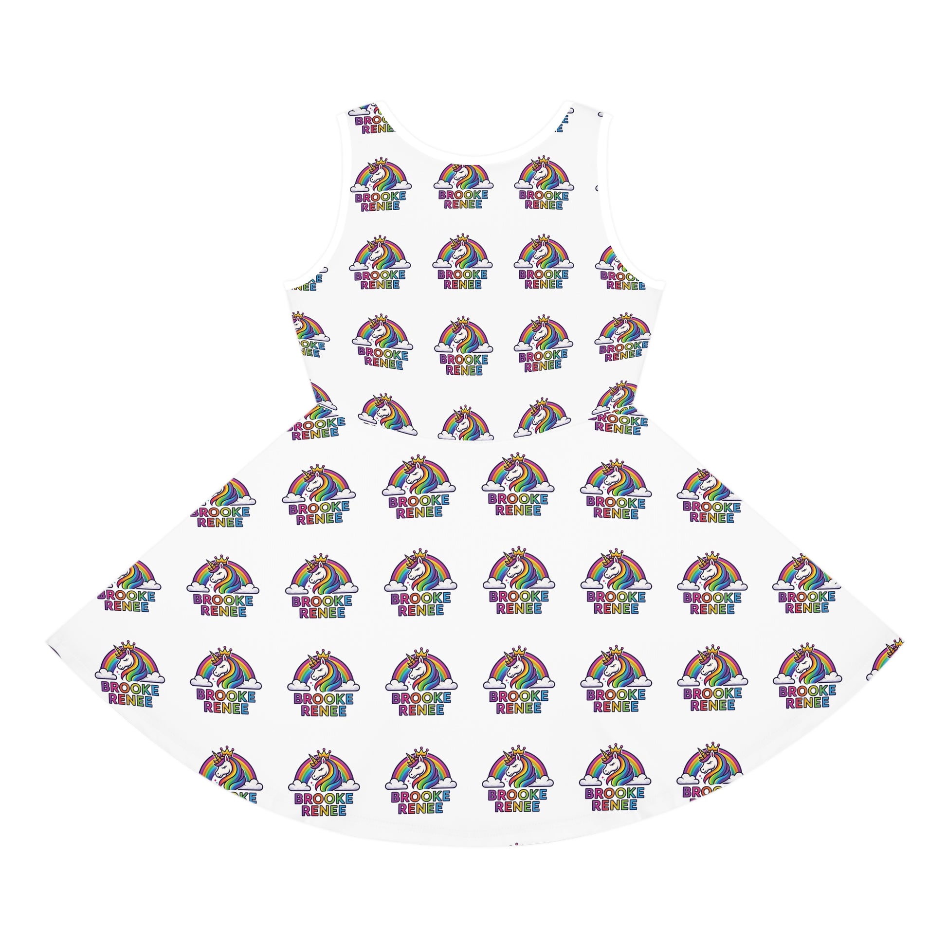 This mid-length A-line sundress brings bright, playful energy to sunny days. Lightweight and softly stretchy, it moves easily with a child at play — twirling, climbing, and lounging in equal comfort. The round neckline and sleeveless cut keep things breezy, while the full skirt catches airflow for joyful spins. Colorful unicorn-and-rainbow artwork sits across the bodice and floats near the hem, giving the dress a whimsical, personalized feel that lights up casual outings, birthday parties, and everyday adventures. Easy care guidance helps the vibrant print stay looking fresh: wash gently with neutral detergent and avoid vigorous rubbing. Thoughtfully constructed with double-needle hems and a sewn-in label for long-lasting wear through seasons of fun.